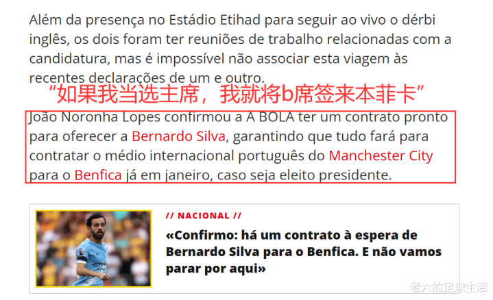 并且于周末带着他的支持者费雷拉前往了曼彻斯特观看了曼城与曼联的比赛,洛佩斯向A BOLA的记者证实,他已经准备好向b席提供一份合同,如果他能当选主席,他将竭尽全力将他签到本菲卡。